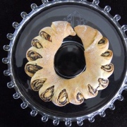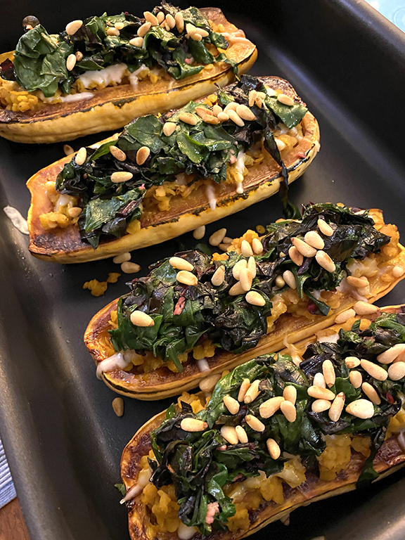 Construct the squash: Place the squash into a fresh baking pan. Fill with lentil mixture until level with the cut edge. Sprinkle on mozarella cheese and place under the broiler just until melted. Remove from oven and, using tongs, place on some greens. Sprinkle with pine nuts and serve.