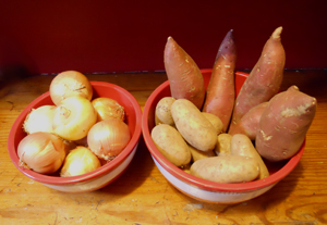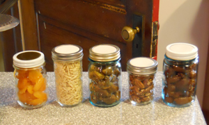 Nicole married my nephew Ari in August. They are freshly minted newly weds. Raised in an Orthodox family, a daughter of South African Jews, I imagine that Nicole’s first Passover away from home as a married woman might be a little lonesome. I asked if there was a food that she’d like to have at our Seder, something that she would ordinarily have at her family’s celebration, and she suggested this charoset. Her mother, Jane, sent the “recipe,” which, in true Jewish mother tradition, is nothing more than a list of ingredients: dates, figs, almonds, dried apricots, honey and wine, with sometime the addition of raisins, apples or walnuts. With no set quantities, I went to our local organic food shop and bagged and labeled the various ingredients. Laying the plastic bags with their long, white, coded twist ties on the counter, all in a misshapen jumble, I thought about how inelegant this would be to work with. Nicole was arriving the next day and would assemble the charoset in my kitchen. Embracing my Auntie-ness I emptied the items each into their own mason jar and arranged them in the pantry. I loved the effect so much that I then emptied out  onions and sweet potatoes from their  bags and made a little arrangement in the big red bowl in the butler’s pantry. I loved how inviting the kitchen looked, ready for the women to work together, to share some old traditions as well begin some new ones.
