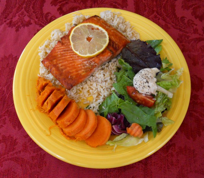 The star of tonight’s meal was the salad dressing. I remembered my mother’s Caesar recipe and threw this together in just a couple of minutes. Yes, the salmon was lovely, broiled with just a splash of soy sauce and a squeeze of a lemon; I love the brown basmati rice which is full of flavor and a little gritty; and sweet potato is a treat now that they tell us it’s healthy; but the Caesar dressing was the most exciting flavor on tonight’s plate: