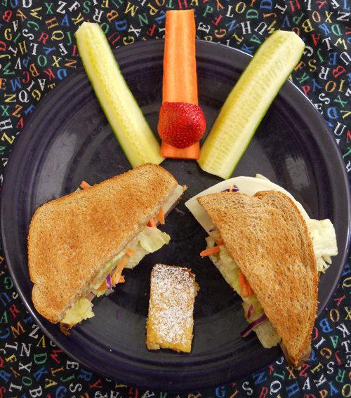 Make a roast beef and provolone on toasted whole wheat, easy on the mayo. Then throw in a handful of mixed salad for crunch, and arrange a happy pattern of their favorite vegies and fruits. The bonus today was a leftover citrus bar on each plate. It sure made them happy that it was lunch time.