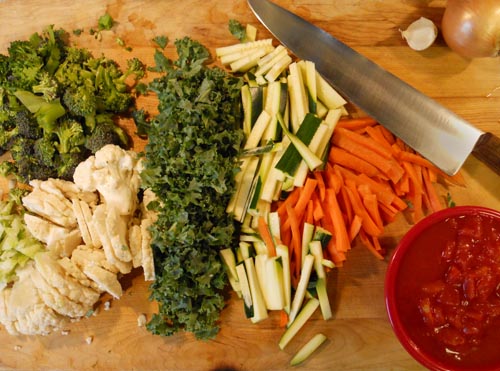 Vegetables included in this dish are: broccoli, kale, zucchini, carrots, tomatoes, onion, cauliflower and cauliflower greens.