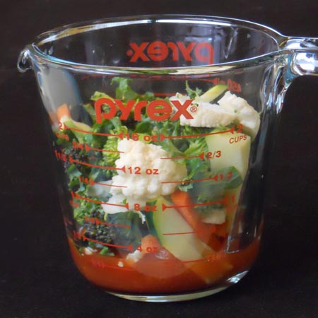 As an experiment, I took of 1/6 of each vegetable and put it in a Pyrex measuring cup just to see what we were all in for: