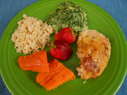 I’m certainly not claiming that this is a no-fat dish, so if you are planning on serving something like this, then for goodness sake balance out the rest of your meal with simpler dishes. Tonight we had rotisserie chicken, plain baked sweet potatoes, plain brown rice, and fresh strawberries. When you look at the delightful mixture of color on your plate, you can feel good about enjoying this decadent-tasting creamed spinach.