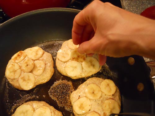 Before flipping the pancakes over, after they are bubbly, top with a layer of the sugared banana slices.