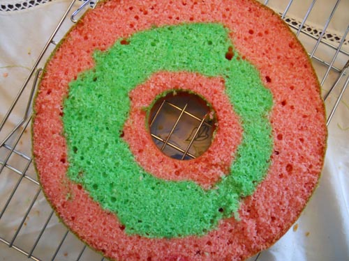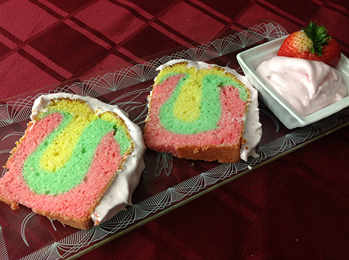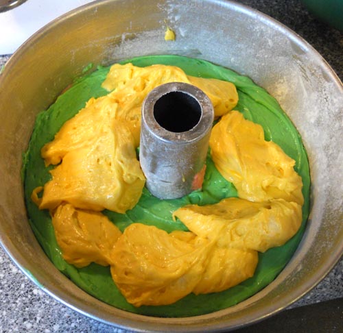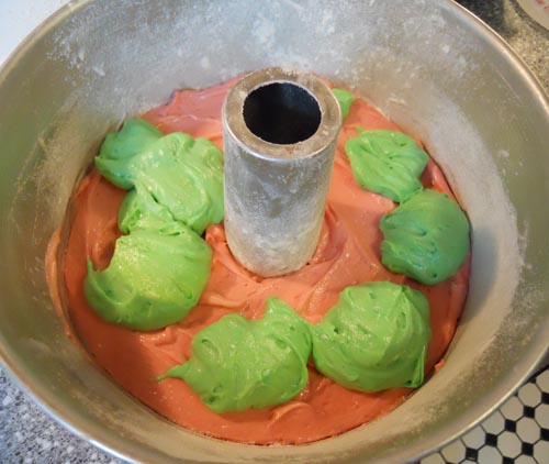 Grease and flour a 10 x 4 tube pan with a removable bottom. First pour in pink batter carefully with a spoon and spread it gently; then with spoon pour in green batter, and lastly yellow batter.