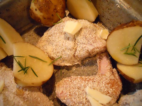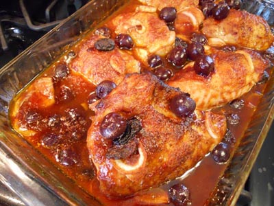 Chicken Jubilee, topped with cherries, raisins and onions, hot out of the oven.