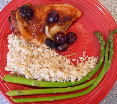 Season the chicken, brown in a little oil. Combine all ingredients except for sherry and cherries, pour over chicken, and bake at 325 degrees for 1 hour. Pour sherry and cherries over wine, bake an additional 15 minutes. Serve hot over rice.