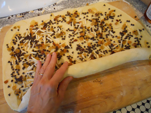 Ida’s yeast cake is rising on my attic floor. While the a.c. is running downstairs, the attic is hot and steamy and a terrific place to leave a yeast cake to rise. This is the dough our family uses to make hamentashen for Purim, and it also makes wonderful babkas and coffee cakes. Today I’m making two coffee cakes, filled with almonds, golden raisins, chocolate chips, cinnamon and honey.