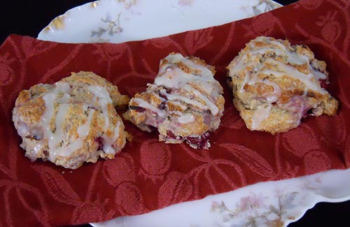 Mix together the dry ingredients and cut in the butter. Mix together the egg and the yogurt, add the cherries and fold into the dry ingredients. The scones may be formed in several different ways: drop them by large spoonful; divide into two parts, pat each into a circle, and cut each into 6 wedges; or pat out on a floured board and cut into circles with a large biscuit cutter. Place the formed scones onto a lightly greased cookie sheet. Lightly sprinkle each scone with a little granulated sugar. Bake for 15 minutes at 450 degrees.