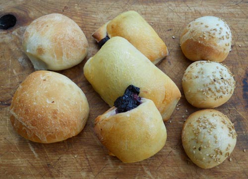 Potato knishes, blueberry buns and knishes with sesame seeds.