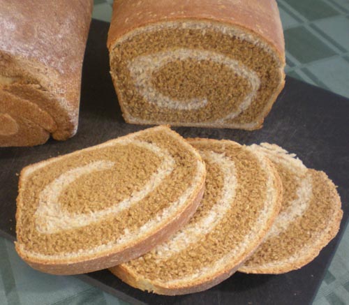 1. Let the doughs rise for 1 hour or until doubled in size. Divide each dough in half. Roll out one piece of the dark dough into a rectangle about 8″ x 10″. Roll out one piece of the light dough and place it on top of the dark dough, then roll together tightly and place into a greased bread pan, seam side down. Repeat for the second loaf (If you like, you can change the order of the dark and light loaves ) Cover and let rise for 45 minutes. Bake at 350 for 45 minutes.