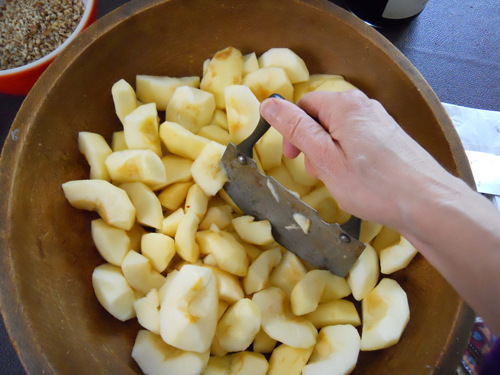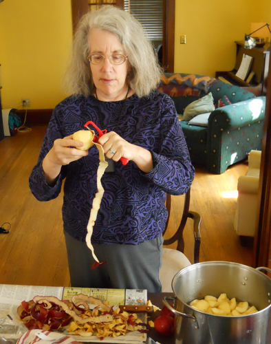 Maralee peels the apples, cores them, and places them into cold water so that they don’t brown. (She likes to see how long she can make the peel.)