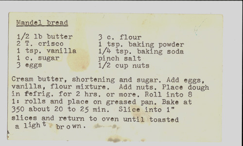 mandel bread recipe card sm Published October 12, 2011 at 500 × 301 in If you’re a crispy, these are for you: Mandel Bread ← Previous Next → Ruth Gordon’s recipe card for mandel bread.