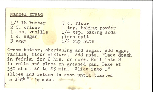mandel bread recipe card sm Published October 12, 2011 at 500 × 301 in If you’re a crispy, these are for you: Mandel Bread Next → Ruth Gordon’s recipe card for mandel bread.