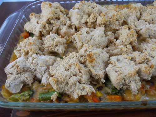 I didn’t break anything, I only had a cold, and so I can’t claim to be anywhere in a league with Ruth Gordon. Yet even though I was feeling ill I felt compelled by that mysterious, maternal force to produce a meal. The day before I had taken out the bag of frozen turkey scraps which had been in the freezer since Thanksgiving, and it was time to use them or toss them. As I lay in bed all day, feeling sorry for my pitiful virus, I contemplated the thawed turkey scraps and how I had planned on a lovely pot pie for dinner. Feeling the need to make dinner, and also feeling very lazy, I made a hurry-up version of a pot pie, making more of a cobbler than a pie. I made pot-pie filling as usual, poured it into a casserole dish, then mixed up a batch of biscuits in the food processor and glopped on bits of the biscuit dough on top of the filling,
