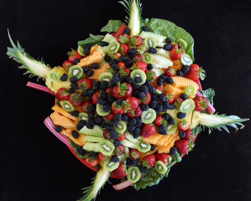 This giant fruit platter will make a beautiful, edible centerpiece and a colorful addition to any buffet or pot luck. The one described here is suitable for summer fruits, when melons are in season. In the winter you can substitute peeled, sliced orange wheels and grapes.